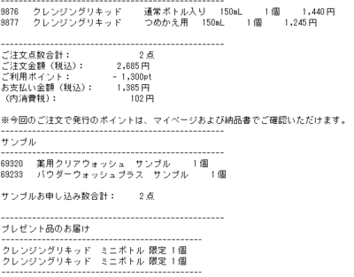 タイミング良く別のキャンペーンで付与されていた300ポイントも一緒に使って1,300円引き。プレゼントでミニボトルが付いてくる期間だったのもラッキーでした。