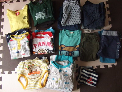 中段左から:Tシャツ5枚(90)、Tシャツ2枚(95)、Tシャツ1枚(100)、長ズボン1枚(90)、長ズボン2枚(100)